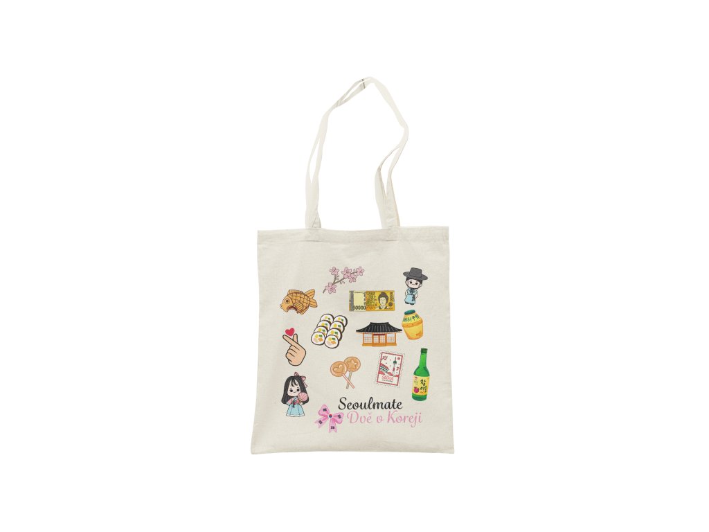 Natural 2 - Tote bag ilustrovaná, která je plná malých samolepek, které roztomile vystihují korejskou kulturu. Je to nejhravější kus celé kolekce, takový “walking scrapbook”.